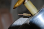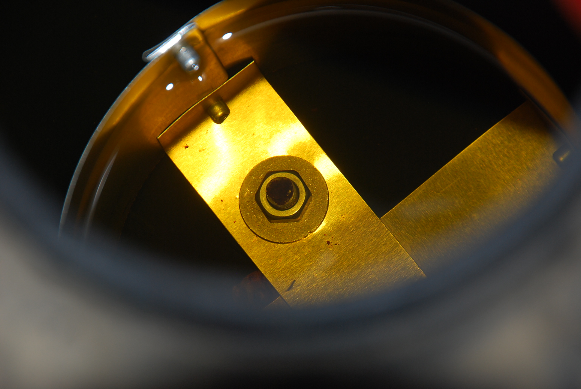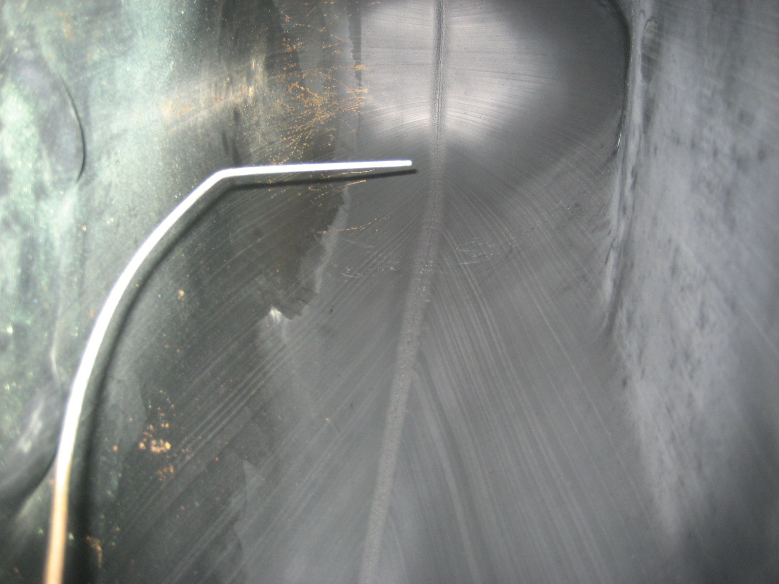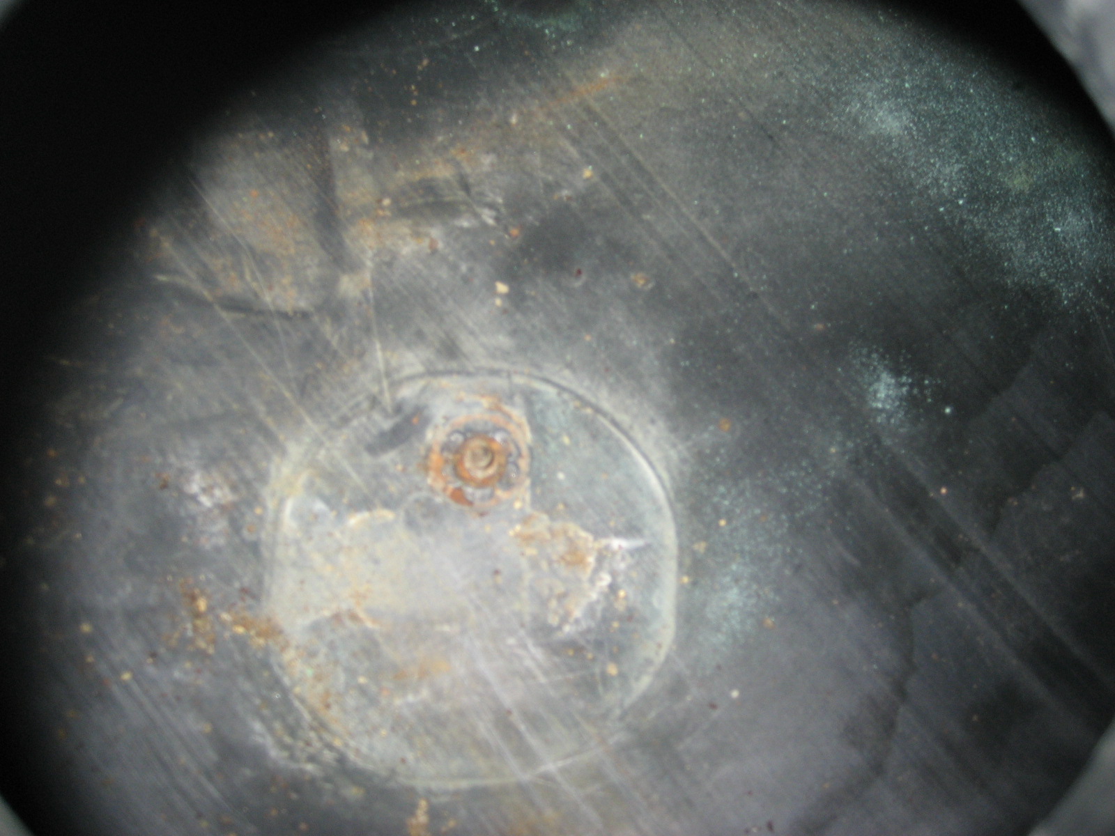 inside of the tank, showing the grounding rod tip (the blue powder is the corrosion cleaned off the rod), the mount for