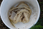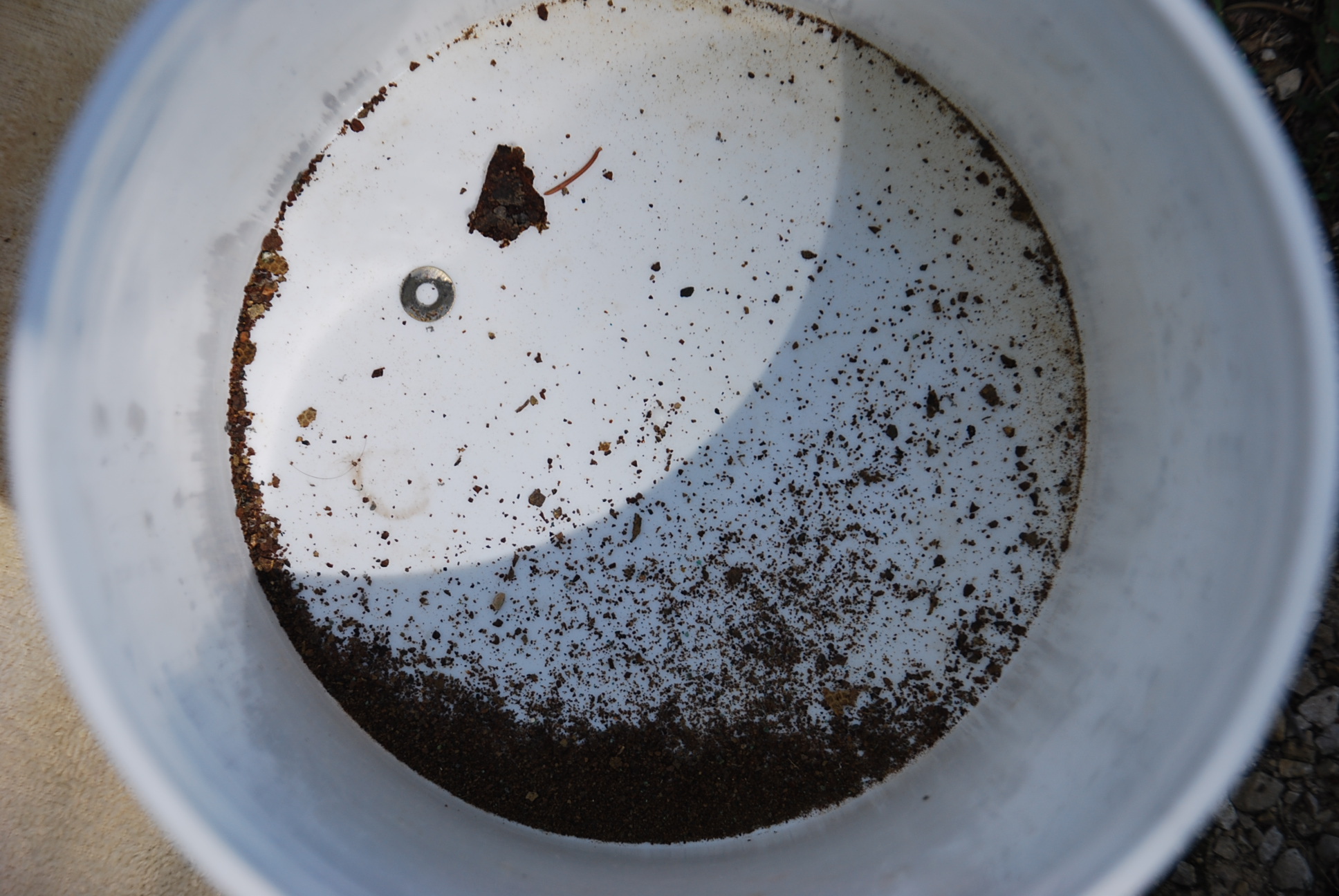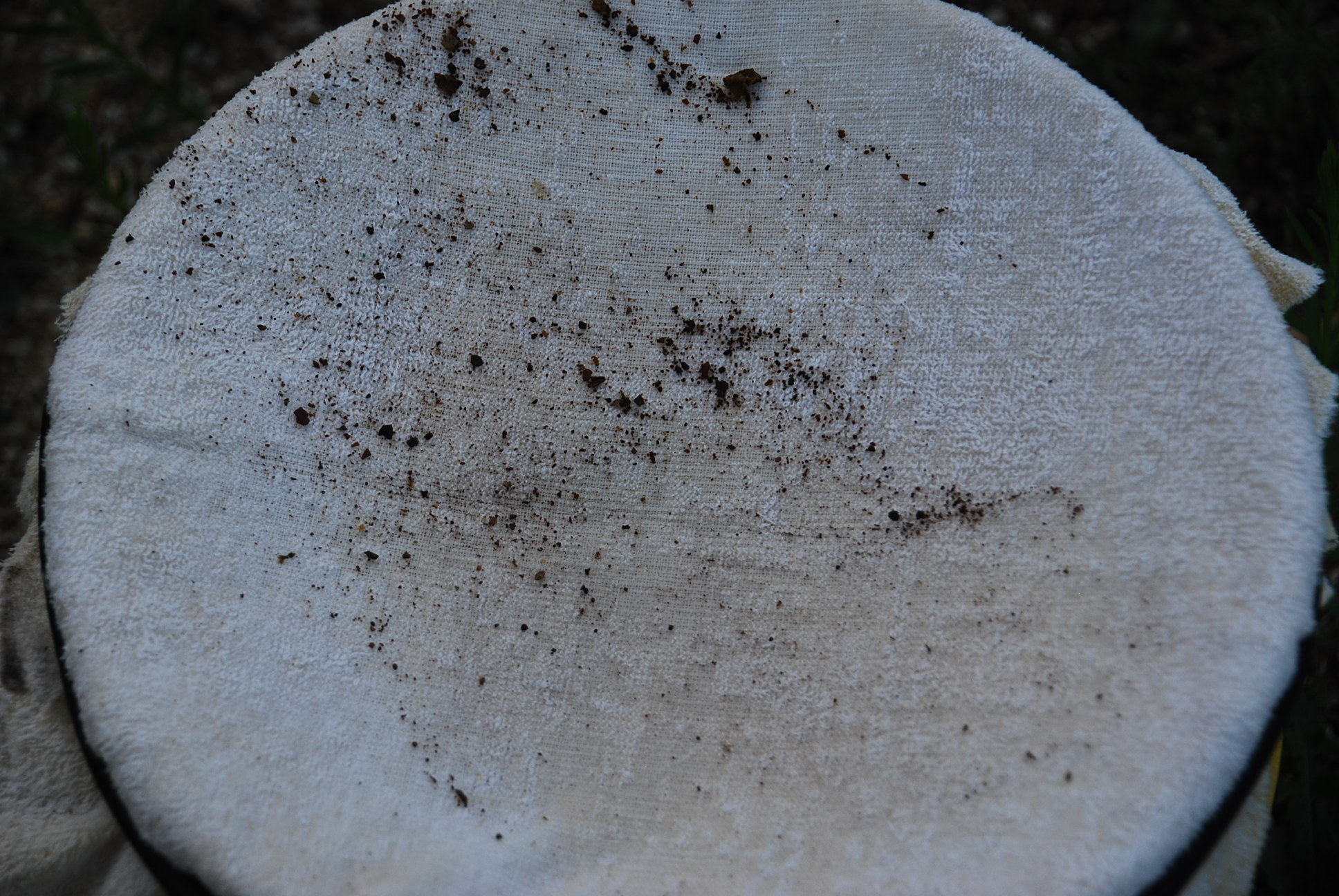 bucket, and then poured this gas through a couple of filters (aka, a towel and a t-shirt) into another can. I inspected the